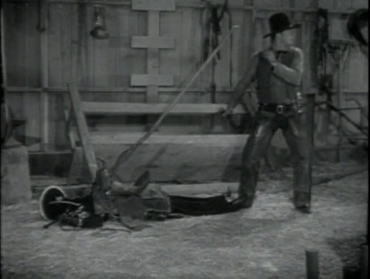 The fight scenes are especially prominent and well executed, and Republic must have spent half its budget for this picture on breakaway furniture. Several locations are demolished by fights (including the newspaper office, the stagecoach office, an abandoned mine tunnel, and several barns and shacks), the fighters throwing each other over and through objects, and the furniture and any loose items being turned into impromptu clubs or missiles. When a fight breaks out in Barbara’s sitting room, with its flimsy knick-knack shelves and parlor furniture, it’s as thoroughly trashed as in any juvenile delinquent movie of the 1950s. In another fight scene, everything in the room, up to and including a cast-iron stove, comes crashing down during the brawl. It’s a credit to the choreography that these fights never become dull or repetitive.