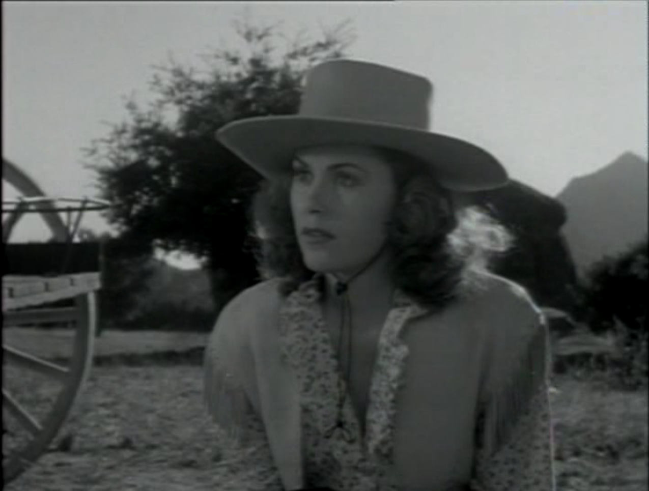 After a montage of masked horsemen attacking wagon trains, burning settlements, and robbing a bank, the scene changes to a meeting of the “citizens’ committee,” including pro-statehood newspaper editor Randolph Meredith, at the offices of stagecoach operator Dan Hammond. A federal commissioner is arriving in the territory in response to the bank robbery, driven by Meredith’s sister Barbara; he’ll take charge of law and order in the area until the elections.