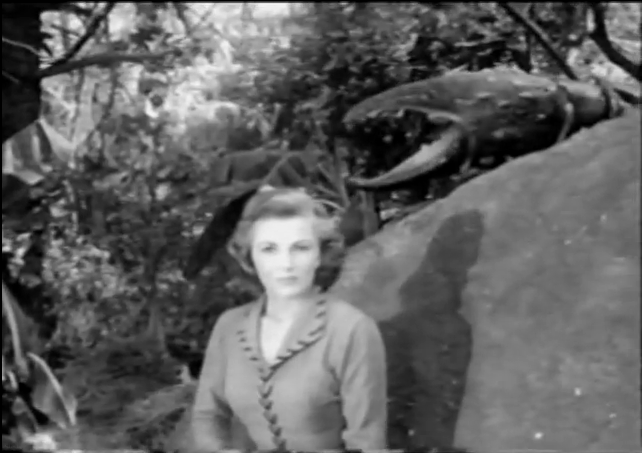 It should be immediately apparent that the “devil beast” (alternately, “claw monster”) actually is a normal crawfish filmed in extreme close-up to make it look large, sometimes surrounded by miniature props (provided, as always, by the Lydecker brothers, Howard and Theodore, who at least receive onscreen credit this time) to give it a sense of scale. Even better, the actors are sometimes inserted into the foreground via rear projection, relying on perspective to enhance the illusion, but just as often the creature’s size is implied through the magic of editing. And when someone is unfortunate enough to be attacked by the devil beast, it takes the form of a single enormous claw extending from offscreen, like the giant hand grabbing Fay Wray in King Kong.