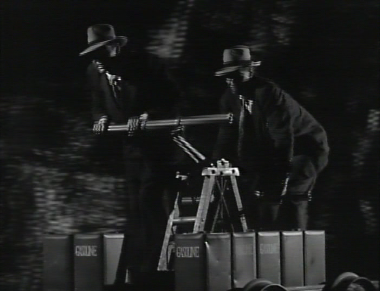 I enjoyed Government Agents vs. Phantom Legion well enough, but it’s hard not to detect a bit of bait-and-switch in its gloriously clumsy title (not to be confused with 1949’s Federal Agents vs. Underworld, Inc. or 1953’s Canadian Mounties vs. Atomic Invaders) and the proto-Drew Struzan-style poster, which suggests sci-fi with a side of superheroics. Well, there are government agents in the serial, and the atom-age symbolism is justified by the presence of refined uranium, radar equipment, and electronics being among the goods the truck hijackers are stealing, but that high-tech equipment is for the government: it never actually sees use on screen. The real meat of the action–car chases, fist- and gunfights, traps and cave-ins and explosions–could have been filmed at any time in the previous two decades. (Even the perils that could be termed science-fictional–capsules of poison gas, hidden radio transmitters for eavesdropping, a truck driven by remote control–were being featured in the serials of the 1930s.)