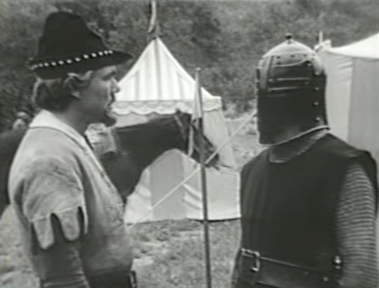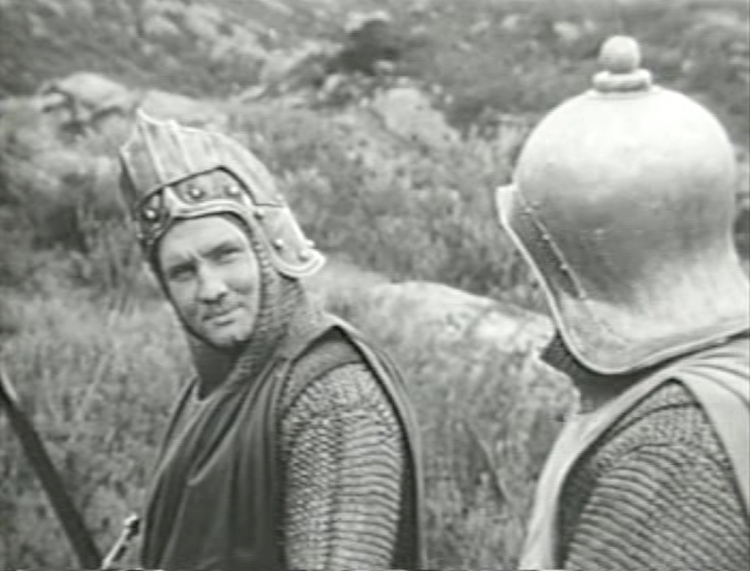 The Adventures of Sir Galahad boasts a large cast for a serial, but the difference between serial and feature shows in the battle scenes, where one might expect hordes of extras: a dozen men on horseback is large enough to make a convincing posse or Indian war party in a Western, but when such a group is meant to represent the entire Saxon army, it’s a little puny. Galahad‘s fight scenes are more impressive when staged in close quarters (such as several fights that take place in an inn, or in mountainous terrain), hiding the small number of men involved and making the fight look more crowded. In many ways, The Adventures of Sir Galahad bears a close resemblance to the low-budget fantasy features that would become popular in the 1950s, such as Bert I. Gordon’s The Magic Sword or the many films about Hercules or Sinbad.
