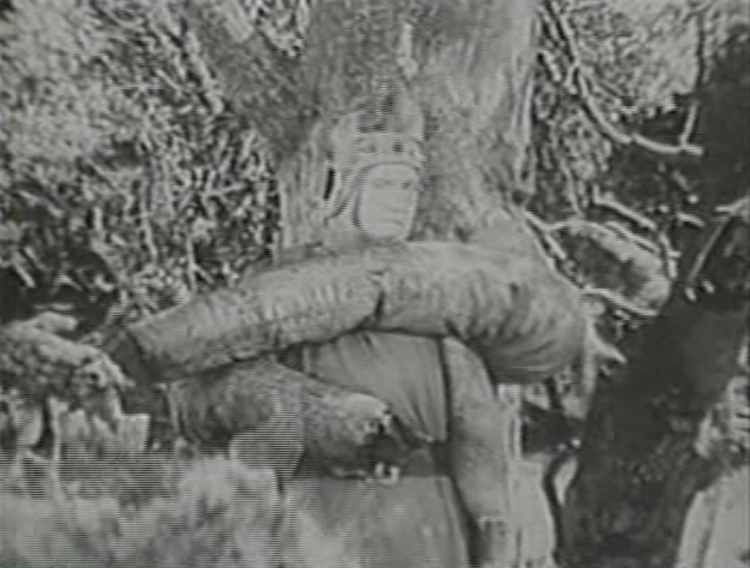Best Cliffhanger: At the end of Chapter One (“The Stolen Sword”), Morgan le Fay has directed Galahad to find answers in the Enchanted Forest; this is Merlin’s domain, from which no man has returned. As Galahad and Bors enter, they are accosted by strange voices and sounds. Merlin appears and bewitches Galahad so that he can’t move; then Galahad is grabbed by a suddenly mobile tree, while flames dance around him. It’s a pretty intense and strange cliffhanger that lets us know we’re going into the deep end of fantasy here. Alas, my hope that all of the cliffhangers would be magical or fantastic wasn’t lived up to. Some are, and there are a few medieval-specific cliffhangers, like one in which Galahad is strapped down beneath a swinging spiked ball, à la The Pit and the Pendulum; but most are the typical falls or brushes with death common to all serials. But man, that first chapter: it’s a doozy.