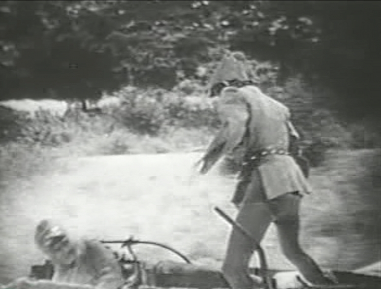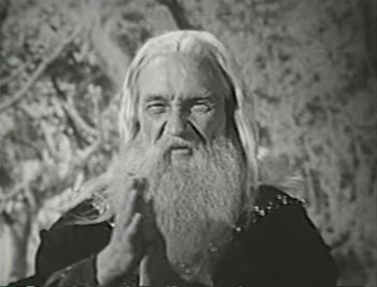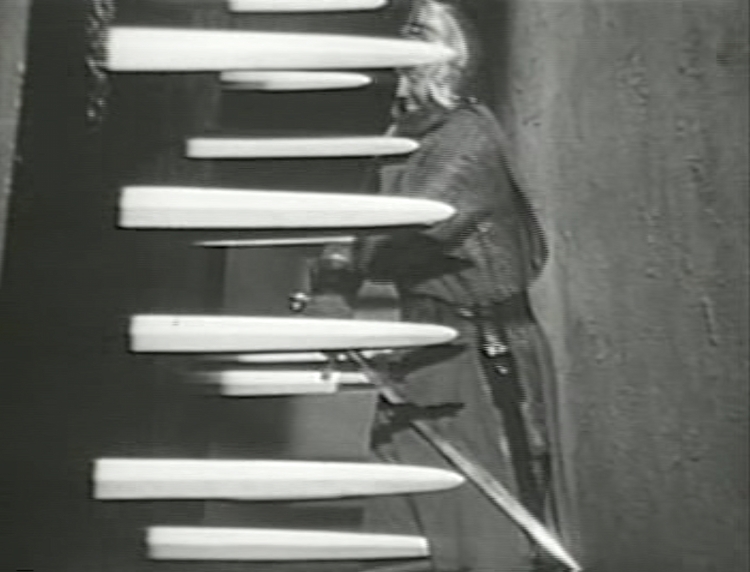 In fact, The Adventures of Sir Galahad is unusual in its choice of setting: there are very few serials that deal with medieval or mythological settings (but see Jerry Blake’s comments below). Film studios were regularly releasing features about Arthur, Robin Hood, and other legendary figures, so sets and costumes would have been available for serials (Columbia’s The Green Archer features a castle and a Robin Hood-like character, but is set in modern times), but Galahad remained an outlier. It’s largely a successful hybrid, however: the struggle of the knight and his partner to solve the mystery and prove his innocence lends itself to the episodic rhythm of a serial; there are plenty of opportunities for fight scenes, both skirmishes and full-on battles, and the abundant swordplay makes a nice change from fistfights and shoot-outs; the disguised villain is very typical, comparable to such bad guys as the Scorpion or the Dragon (it ends up being exactly who you think it is, but still); and the frequent magical interference of Merlin (as well as Morgan le Fay, who has a few spells of her own) provide opportunities for unusual and inventive special effects and camera tricks.