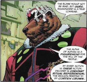 Kamandi is brought face-to-face with Groznovo, the “Alpha of Alphas”; Mishkingrad, the “God-Commune of the Bears” is a high-tech Soviet collective (because bears, get it?), and Groznovo wears a crown that receives and tallies the collective decisions of the commune’s inhabitants, which he interprets and executes. His status as a channel for the will of the people is quite literal. Kamandi challenges Groznovo’s position, telling him that by being subject to the constantly shifting demands of the people he has merely chosen a different form of slavery, and is free of the burden of ever making his own decisions. Groznovo accepts this idea surprisingly quickly, and in fact lets Kamandi know that he has been tiring of the demands of duty for some time. If ever there was an opportunity for him to break free from the commune’s collective rule, Kamandi has presented Groznovo with it; the bear promises to lead Kamandi to where Renzi is being held.
