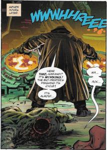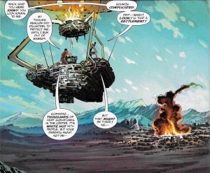 Throughout their flight through the city, Kamandi notices strangely anatomical references that go beyond the usual discussion of a city’s “bones”: the transit system is referred to as “vascular,” and so on. Near the end of this chapter we see just what Renzi’s atomic-powered heart is being used for: the “God-Commune” is a giant, self-contained city, but it is in the form an enormous, autonomous bear, and with Renzi’s heart as its reactor, it can generate enough power to get up and move about freely. Ultimately, Groznovo has been playing Kamandi: the bear truly wants to be free, but he will not betray the commune’s ideals. He has led Kamandi away from the furnace in which Renzi is being held captive. Kamandi accuses Groznovo of using him, and the pair fight as the bear-shaped city plods along, leaving flames in its wake. Groznovo makes it clear that in a choice between loyalty to Kamandi and his own people, he will always choose his people, and he reluctantly throws Kamandi overboard.