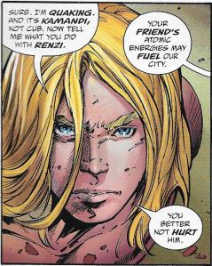 After Kamandi awakens, good as new, Mack chooses to stay behind and look for a cure for weeping pox among the late doctor’s resources. To help Kamandi continue his search for his people, he directs him to an old friend, a superhuman scientist named Renzi. Renzi is a character from Jack Kirby’s original Kamandi series, but his appearance here is largely a cameo. The pair are shown traveling by high-tech hot-air balloon just long enough to establish that Renzi possesses a “cyclo-heart,” an atomic energy source that allows him to change his body to a metallic substance for short durations, before they are shot down over an unknown source of intense heat. Renzi assumes his steel form to protect Kamandi, but both black out in the crash; they awaken in chains, the prisoner of intelligent bears. Renzi is separated from Kamandi: the bears have use of his cyclo-heart.