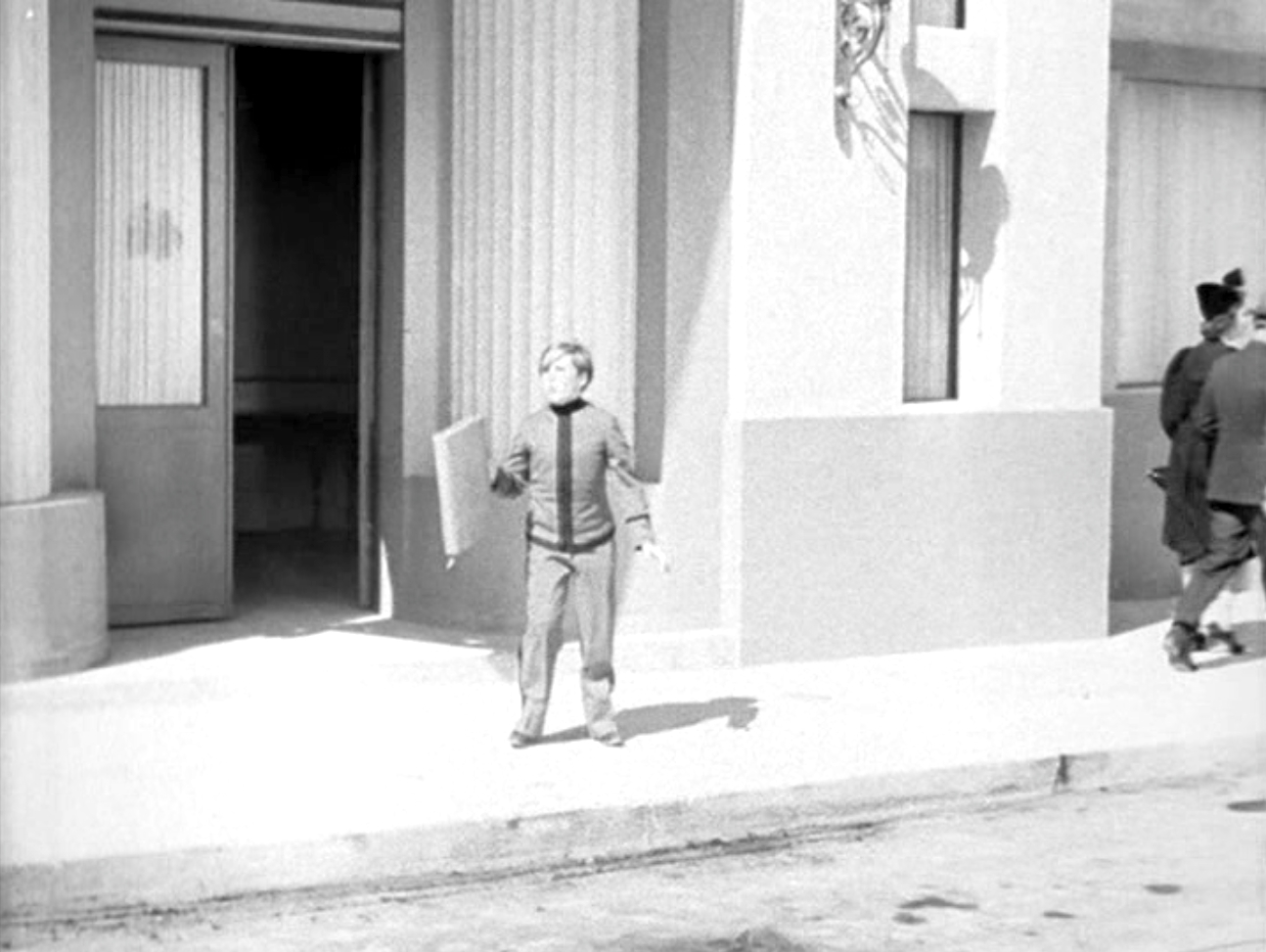 Soon, at Gwen’s summons, Tracy excuses himself to hear what she has to say: there is no Mr. Reeves on the Phoenix Chamber of Commerce! Tracy returns to his office to find that “Mr. Reeves” has been called away suddenly and has “accidentally” left his briefcase there, and that Junior, unaware of the danger, has picked it up and is attempting to return to its owner, even chasing the hit-man’s car down the street yelling “HEY, MISTER! WAIT!”