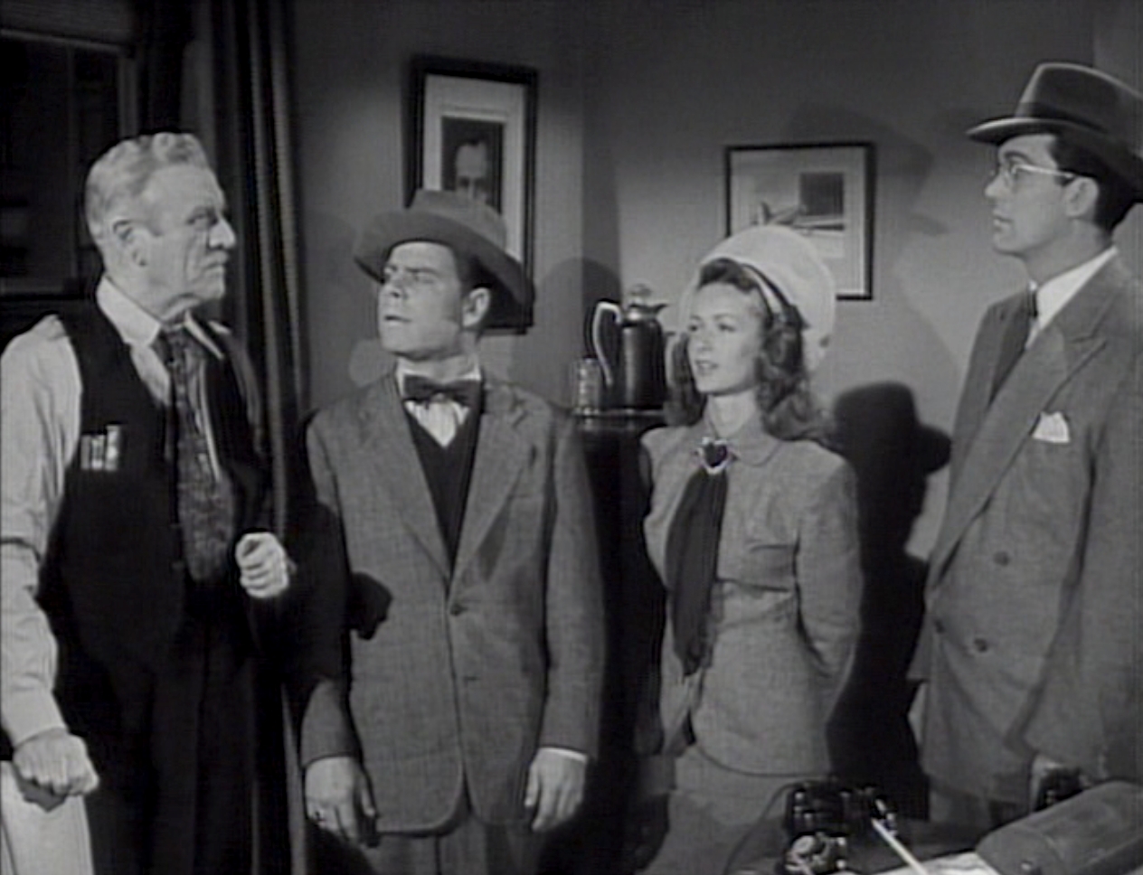Having said all that, Dick Tracy Returns clearly follows Dick Tracy (1937) in continuity, however loosely: Ralph Byrd returns in the starring role; Tracy is still a G-Man in the West rather than a Chicago police detective; and the supporting characters surrounding him are the same, although recast: Steve Lockwood (Michael Kent, replacing Fred Hamilton) is Tracy’s partner, Gwen Andrews (Lynn Roberts, replacing Kay Hughes) his assistant, Mike McGurk (Lee Ford, replacing Smiley Burnette) is the bumbling comic relief, and Junior (Jerry Tucker, replacing Lee van Atta) is still present, now officially Tracy’s ward and attending military school.