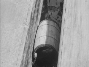 Upon reflection, however, my favorite cliffhanger is the one closing Chapter Four (“The Enemy Strikes”). This chapter takes place in and around a barge filled with explosives. Zarnoff knows that Tracy has tracked him to a dockside salvage outfitter, so he lays a trap, putting a time bomb in the hold of the barge. While Tracy and the G-men shoot it out with the bad guys on the multi-level barge, the timer ticks away; the cliffhanger, however, is not the explosion of the bomb. Dick Tracy discovers the time bomb and throws it overboard, where it explodes harmlessly. Rather, it is set in motion when Robal throws a barrel at Tracy. Tracy dodges the barrel, but instead of continuing to focus on their fight, the camera follows the barrel as it rolls from one ledge to another, Donkey Kong-style, until it lands in the water. There it bobs between the barge and another barge next to it, until the current brings them together: at first, the barrel bulges as it is squeezed, but it eventually splinters beneath the pressure. The danger is clear. Sure enough, Tracy is knocked out and falls into the water, between the two barges, where it is only a matter of time before he suffers the same fate as the poor barrel. Here comes the tugboat to push the barges together. . . .