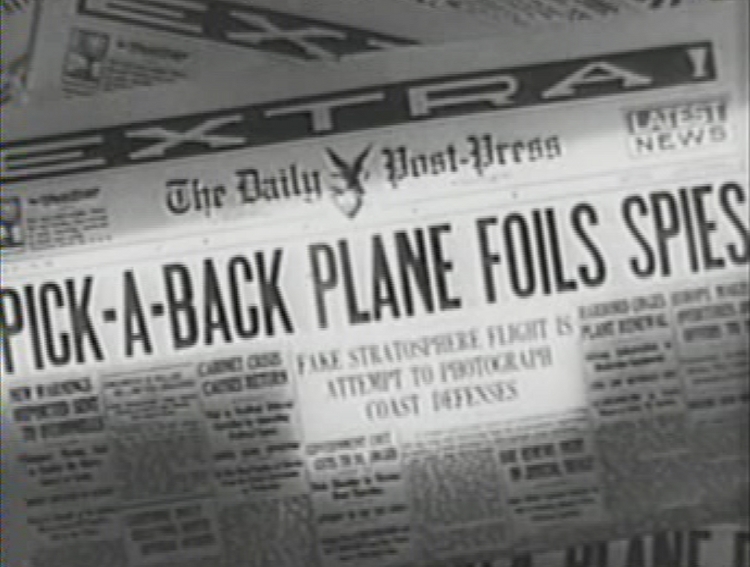 However, after a detour to Littleville, Tommy and Skeeter miss their flight; they decide to follow the dirigible’s path in their own plane with the intention of docking in mid-air. The captain refuses at first, but then a mysterious plane decorated like an eagle appears, and its pilot–also wearing an eagle-themed suit and helmet–sends a message instructing the dirigible to take the boys on board. The eagle plane lays down a smoke screen and vanishes as quickly as it had appeared. Soon the boys have docked and joined their party. But a storm blows up, and with the dirigible’s radio damaged, the only chance to send an S.O.S. is the radio in Tommy’s still-docked plane. He descends into the cockpit while the storm rages around him; suddenly the wind knocks the plane loose from its mooring with Tommy inside it; it plummets toward the ocean below while the dirigible collapses. Will Tommy’s adventure be over before it even begins? Audiences in 1935 would have to wait a whole week to find out in subsequent chapters of Tailspin Tommy in the Great Air Mystery!