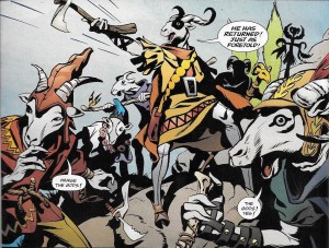 As I’ve alluded to in past articles, comics are a natural medium for the kind of mash-up represented by Space Western Comics: the visual shorthand that is a vital part of comics vocabulary lends itself to mixing and matching. Without attempting to catalog every example of the space Western from later comics, I’ll point to Terra-Man, a cowboy-themed villain from Superman comics. Abducted by space aliens as a child in the Old West, Terra-Man returned to earth with high-tech equivalents of the cowboy’s accessories and an alien winged horse. Current comics have embraced this kind of meta-referentiality with a vengeance, remixing popular iconographies of all kinds with kaleidoscopic variety. Sometimes it’s overwhelming, but I remind myself of being a comics reader in the 1980s, when the Big Two publishers seemed to be embarrassed by anything too “wacky,” and it was left to the independents to publish books like Marc Schultz’s Cadillacs and Dinosaurs (or for that matter, Teenage Mutant Ninja Turtles, as much a mash-up as a parody). I prefer the current acknowledgment of the medium’s silly roots, without the po-faced need to pretend that it’s all serious business.