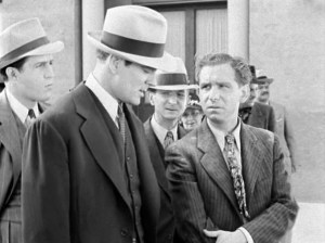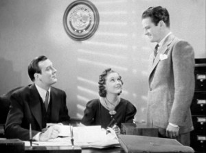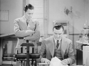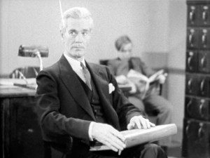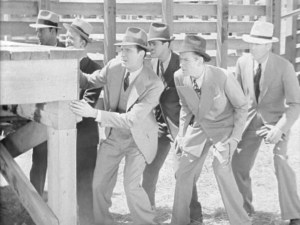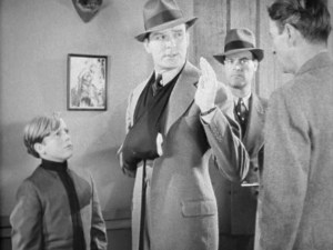 Dick Tracy, still a plainclothes G-Man with the Western Division of the FBI, is lecturing a new class of incoming agents: “Remember,” he tells them, “there are no rules in the game of justice versus crime,” giving a bracing wake-up call to the new agents while reminding viewers that this serial will involve the nuts and bolts of serious police work. Tracy and his colleagues are trained and careful policemen, vulnerable to bullets, not costumed superheroes. Afterward, Tracy greets one of the new agents, Ron Merton (David Sharpe), a promising symbol of the Bureau’s bright future. (Gosh, I hope something bad doesn’t happen to him!)