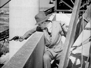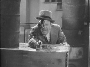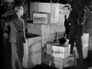 The few high-tech wonders that are included in the story are much more modest–no synthetic radium here–and serve to move the story forward rather than thrilling in themselves: a super cutting torch is stolen from the Navy so that the Starks can use it to cut into a jewelry store’s vault; a “torpedo speedboat” is stolen to sell it to a foreign power; likewise a scheme to steal the motor of an experimental airplane. (One exception is a remote television viewer that allows Tracy to witness the hijacking of the torpedo boat out at sea while he is on the shore, but even then it’s presented matter-of-factly.) As Collins points out (in his introduction on the DVD copy I watched), “Of all the Dick Tracy serials, this is the Dick Traciest!”