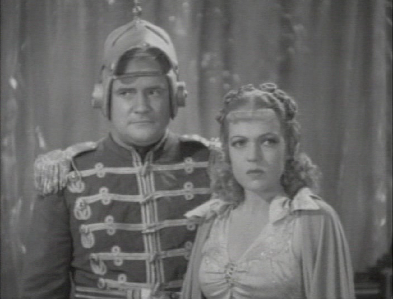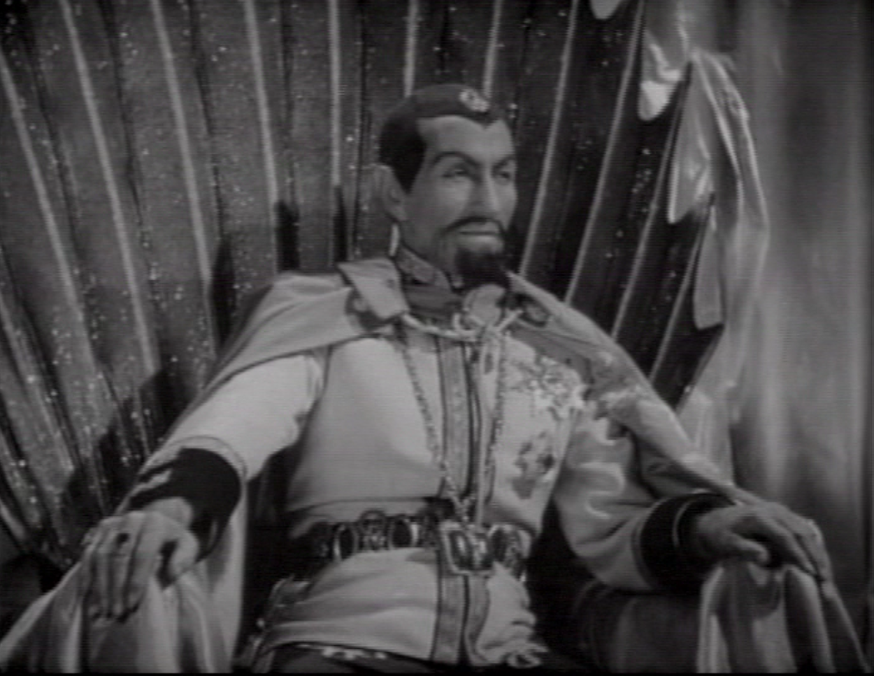 A Note on Costumes: Although there’s still a great deal of space opera exoticism, including long looks at the harem-like entertainments Ming has at his disposal, the costumes and sets display fewer of the ancient or near-Eastern motifs that were prominent in the earlier serials. Barin’s palace resembles a traditional European castle, with parapets and everything, and most of the male characters dress in military uniforms with braids and epaulets; except for the ray guns and space ships, Arboria might as well be Ruritania, an imagined Mitteleuropa in outer space.