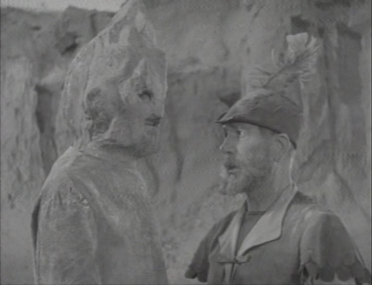 Speaking of Barin and Aura, the happy couple looks quite different from their earlier incarnations. As Barin, Drew cuts a more dashing figure than Richard Alexander: with his trim mustache and forest costume, he strongly resembles Errol Flynn as Robin Hood. As for Aura, the changes to her personality outweigh those to her appearance: instead of the scheming, morally flexible antiheroine of the 1936 serial, she is here entirely settled and content in her life in Arboria, and her reaction to being pulled back into her father’s evil machinations is passive terror and indignation. Marriage has domesticated her.