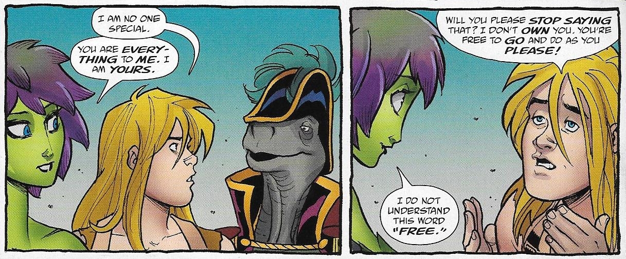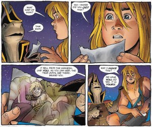 It was when the Atomic Knights encountered warriors from the legendary island of Atlantis, time-warped into the future by their own scientific catastrophe, that I was able to put my finger on the story-telling mode. Replace “radiation” with “magic,” and a story in which armored knights battle Romanesque soldiers from an ancient island could be part of any fantasy novel from the last hundred years. Specifically, the discovery of “Atlantides” (as the islanders are called in this story) fits neatly into the “lost world” genre: as practiced by H. Rider Haggard, A. Merritt, and Edgar Rice Burroughs, among others, there was always the possibility of a remote valley, cave, or island that history and evolution had passed by, leaving a population of dinosaurs, ancient Romans, or other living relics to be discovered. The lost world genre was mostly finished off by World War II, as the empty, unknown spaces on the map were filled in; wiping the slate clean with a global catastrophe allowed writers to open those spaces up again, and fill them with mystery and adventure. In these stories, the lost world was our own.